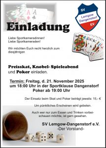 Der Sportverein Lemgow-Dangenstorf lädt seine Mitglieder herzlich zum jährlichen Preisskat, Knobel-Spieleabend und Poker ein, in der Sportklause Dangenstorf.